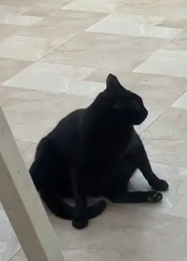 A black cat is sitting on a tiled patio. The cat is facing to the right, looking around, and occasionally looking up. A white metal frame of an object is visible on the left side of the frame.