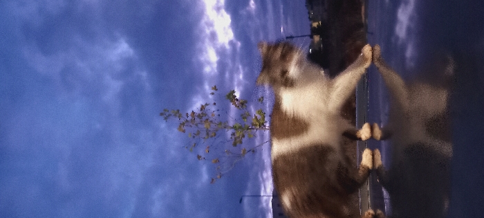 A cat stands facing a reflective glass surface mirroring its image. The cat's fur is a mix of brown, white, and gray. To the left, a small tree with sparse leaves stands against a cloudy blue sky. The reflection shows a less distinct image of the cat against the same sky. The scene is captured at dusk or dawn with subdued lighting.