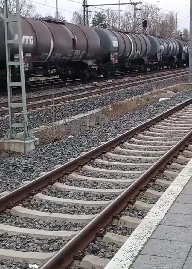 freight train moving on tracks next to a train platform. The train is composed of a long series of dark-colored tank cars, many labeled "VTG" or "GATX." The train moves from right to left in the frame, parallel to the viewer's perspective. The tracks are bordered by gray gravel and occasional tufts of vegetation. A gray concrete platform edge is visible in the foreground. Overhead power lines run above the tracks. The weather appears overcast.