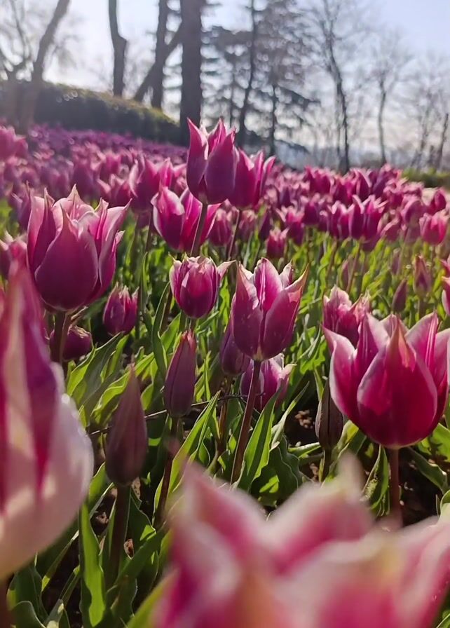 The video showcases a picturesque scene in a garden setting. A vast field of tulips is in full bloom, predominantly featuring a mix of red and white petals. The flowers are in the foreground, creating a vibrant display of color and texture. Further back, a contrasting row of white tulips adds depth to the scenery. In the background, a serene pond is visible, flanked by trees. The presence of trees and the pond contribute to the natural and tranquil atmosphere of the location. The sky is bright and clear, suggesting a sunny day.