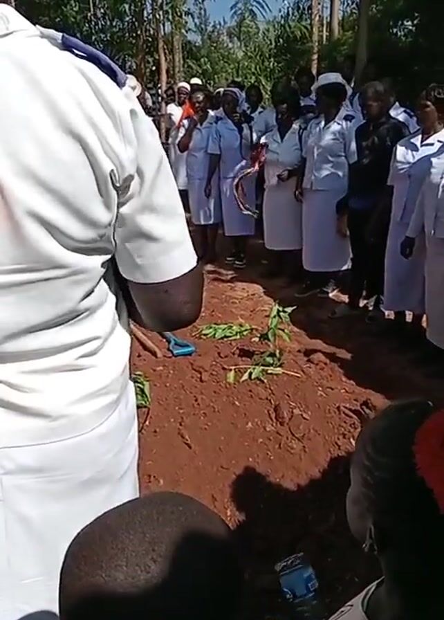 funeral service taking place outdoors. A group of people, many dressed in white uniforms, possibly nurses or medical staff, stand around a freshly dug grave. Green branches or plants lie on the mound of dirt. A small blue shovel rests near the grave. The camera captures the scene from behind other attendees, including children. A brass band plays mournful music in the background, adding to the solemn atmosphere. Tall trees surround the area, suggesting a natural setting.