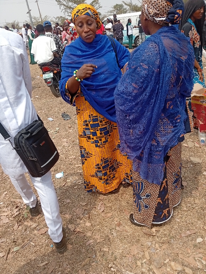 An outdoor scene in Adankolo, Nigeria, depicts a bustling public gathering on dry, dusty ground scattered with debris