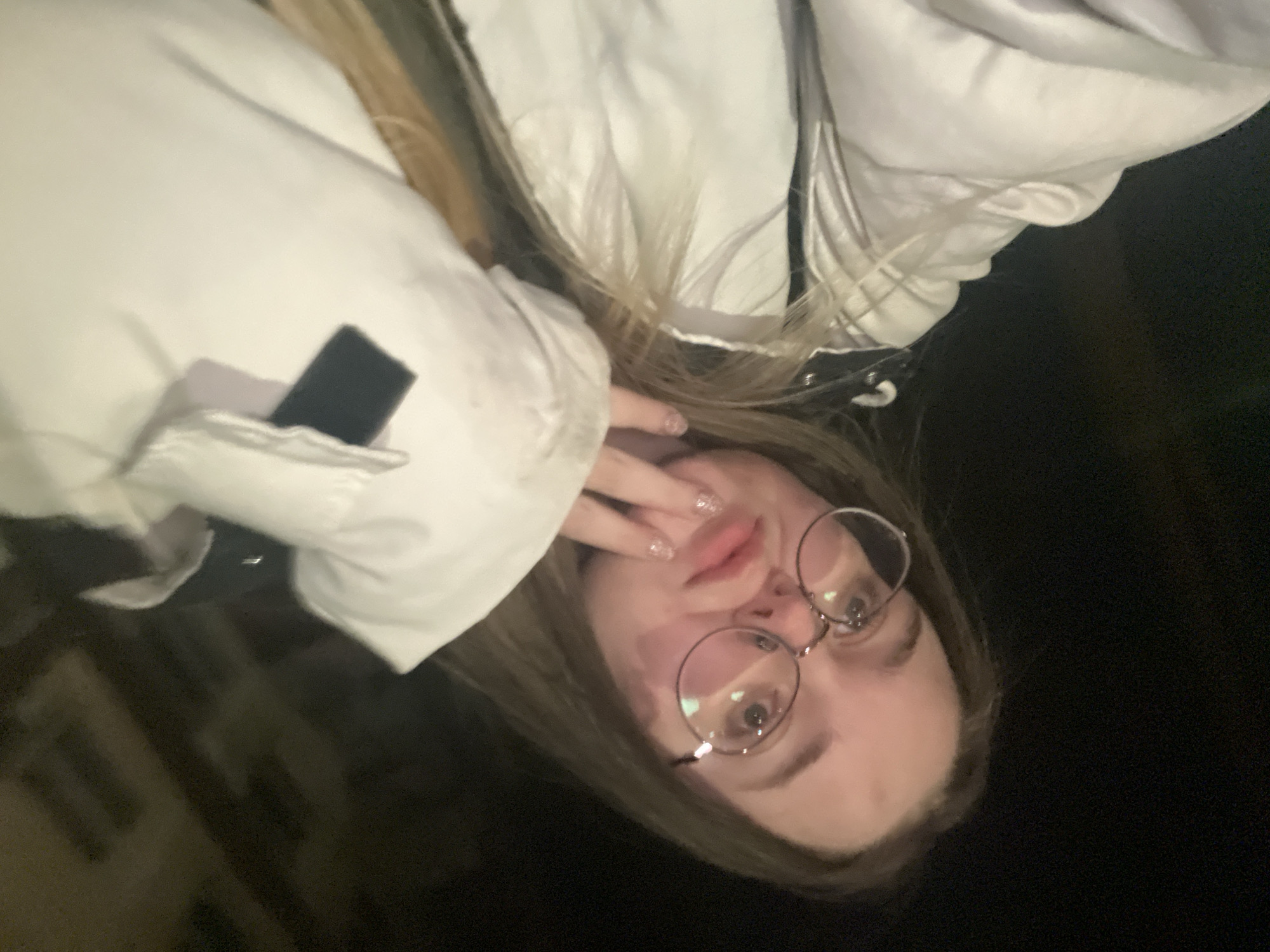 A young female subject is depicted in a close-up, angled shot taken at night or in a dimly lit setting within the city of Pushchino, Russia. She has long, light brown hair and is wearing round-rimmed eyeglasses, through which light reflections are visible. Her face is directly illuminated, highlighting her features. She wears a white puffer-style jacket. Her left hand is raised, with fingers touching her chin area, revealing fingernails with a glitter polish application. The background is dark and out of focus, showing indistinct structural shapes. The subject is looking directly into the camera.