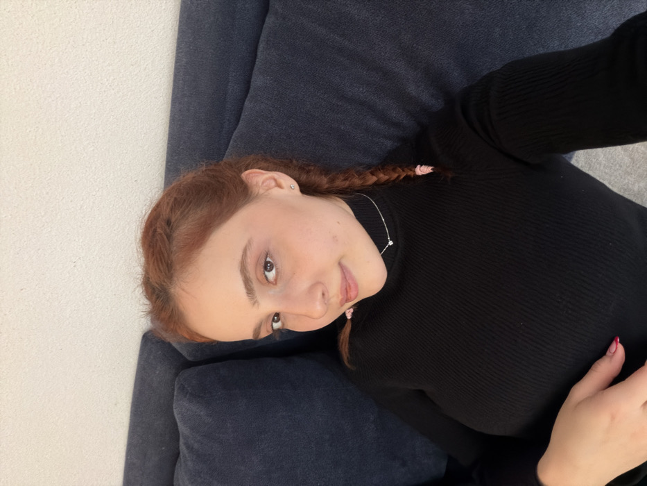 A young female, appearing to be in an indoor setting, is seated or reclining on a dark blue fabric sofa. Her reddish-brown hair is styled in two braids, secured with pink ties, with one braid visible resting on her right shoulder. She wears a black ribbed turtleneck sweater and a thin silver necklace featuring a small, square-shaped pendant. A small silver stud earring is visible in her right ear. Her left hand, with fingernails painted pink in a French tip style, rests on her lap or abdomen. She looks directly at the camera with a slight smile. The background consists of the sofa and a plain, light-colored wall. There are no visual cues within the image to specify a location in the city of Eschau, France, or any other geographical detail.