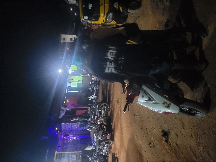 The image depicts a nighttime outdoor scene in the city of Unknown, Unknown. In the immediate foreground, a red and white scooter with a black seat is positioned at an angle. To its right, two individuals are standing; the prominent figure, viewed from behind, wears a dark t-shirt with "SEVEN" printed in white on the back, dark shorts, and dark footwear. A second person, partially obscured, wears a lighter-colored shirt and dark bottoms, carrying a black shoulder bag. The ground is unpaved dirt. In the mid-ground, a collection of motorcycles are parked on the left side, while a yellow motorized rickshaw is parked on the right. The background features several illuminated structures. On the far left, a building with blue neon lighting and signage is visible. Next to it, another building displays a facade with multiple colored panels, including green, light blue, and red, under bright artificial lights. A multi-story white building is discernible further in the distance on the right, also under artificial illumination. The scene is lit by multiple bright artificial light sources, creating strong contrasts and shadows.