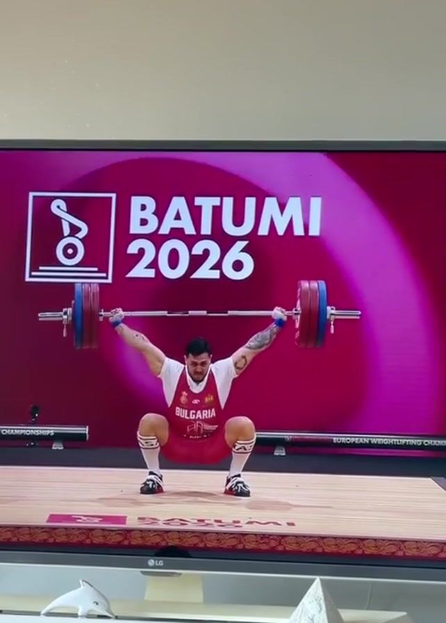 man weightlifting on a television screen. The man is wearing a red and white uniform that says "Bulgaria" on it. He successfully lifts a barbell with blue and red weights. The background on the screen says "Batumi 2026" and "European Weightlifting Championships." There is a white dolphin statue and a triangle object below the TV screen.