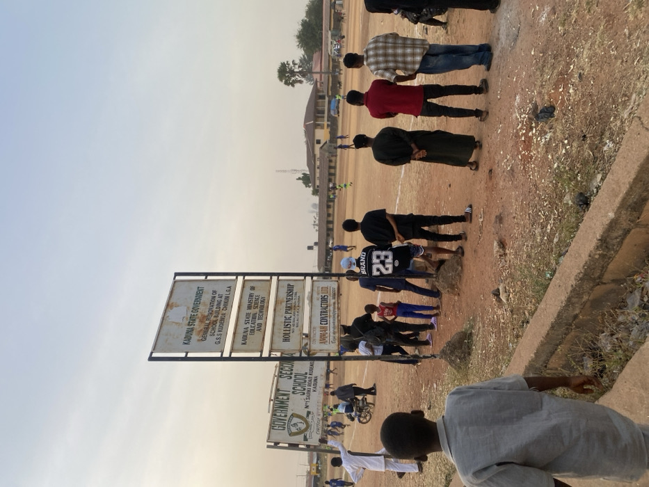 This image depicts an unpaved outdoor scene in Sabon Gari Nassarawa, Nigeria, focused on a dirt football pitch