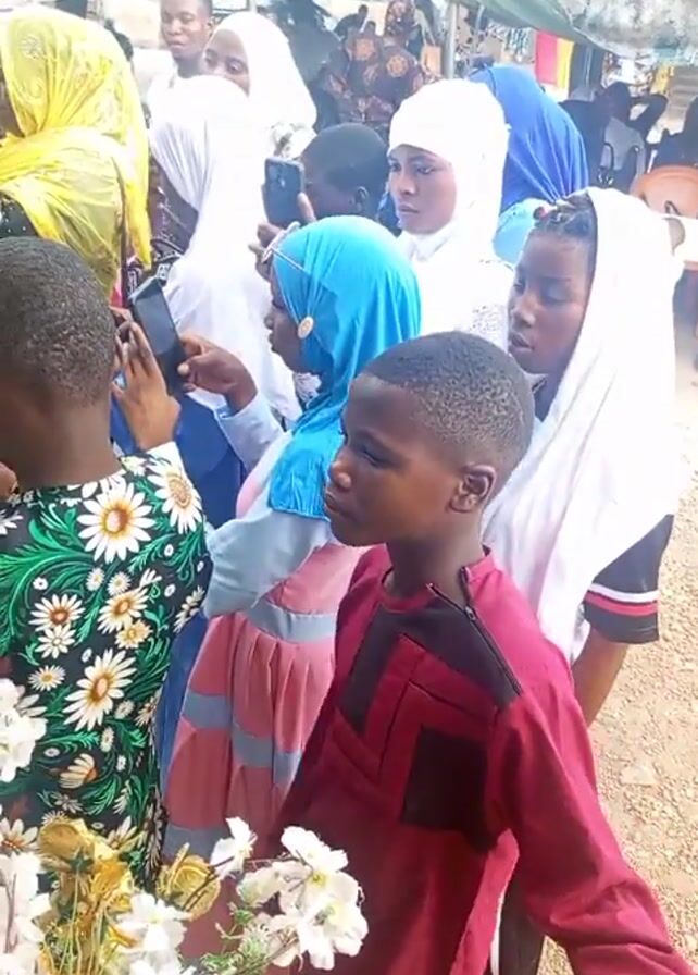 group of people, many of them children, gathered together at what appears to be an event. Many are dressed in colorful traditional clothing, and some of the women and girls wear hijabs. Some individuals are holding phones and taking pictures. It appears there is a bride in the background wearing a gold and white traditional outfit, and people are taking photos of her. The setting seems to be outdoors, possibly in a village or community gathering space. There is some kind of white tent or shelter visible in the background. The overall atmosphere seems celebratory.