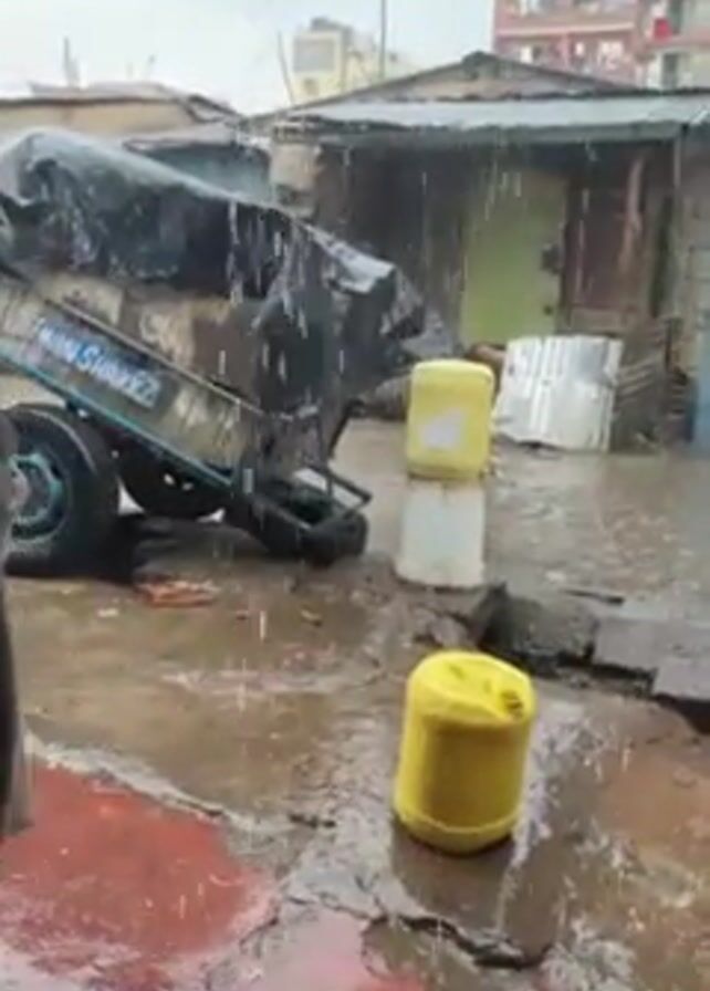 The shot captures a heavy downpour in an urban slum area. The foreground features a muddy, cracked road with puddles reflecting the gray sky. Yellow jerrycans are scattered around. Dilapidated shacks with corrugated iron roofs and brightly colored doors form the backdrop. A man in a brown shirt briefly appears, standing indoors and looking out at the rain. The overall atmosphere is one of poverty and the harshness of the weather.