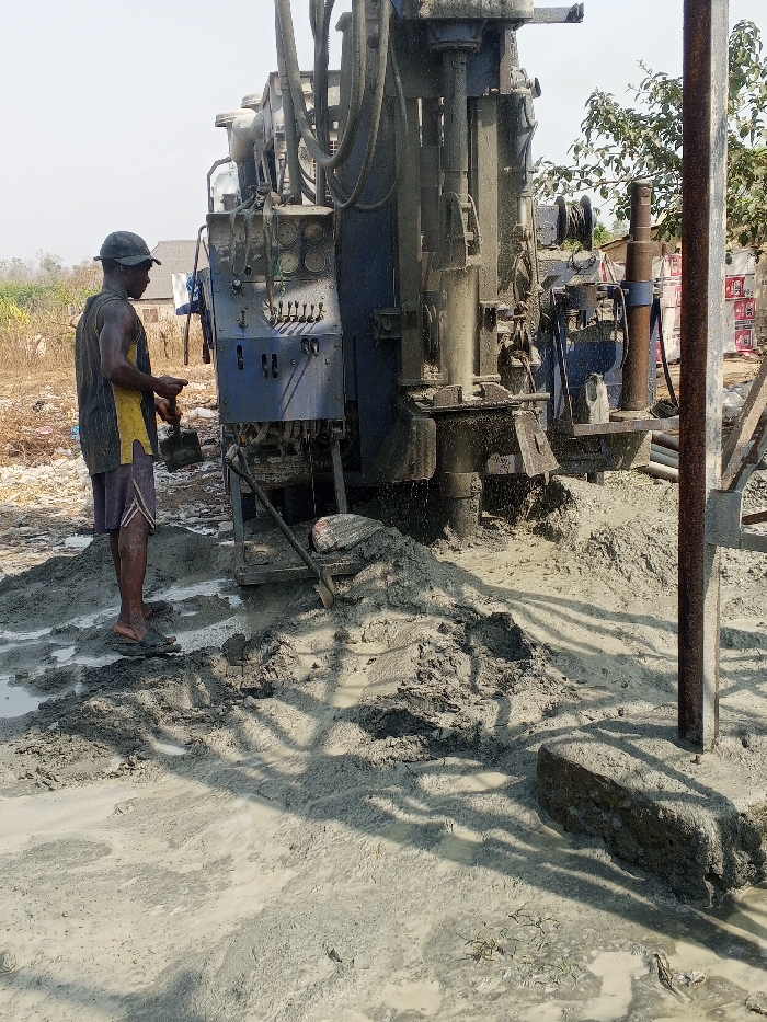 A man in a tank top and cap operates a drilling rig. Mud and water accumulate around the machine and the ground. A shovel leans against the rig's base. The man stands in the mud, controlling the equipment. Trees and buildings are partially visible in the background under a bright sky.