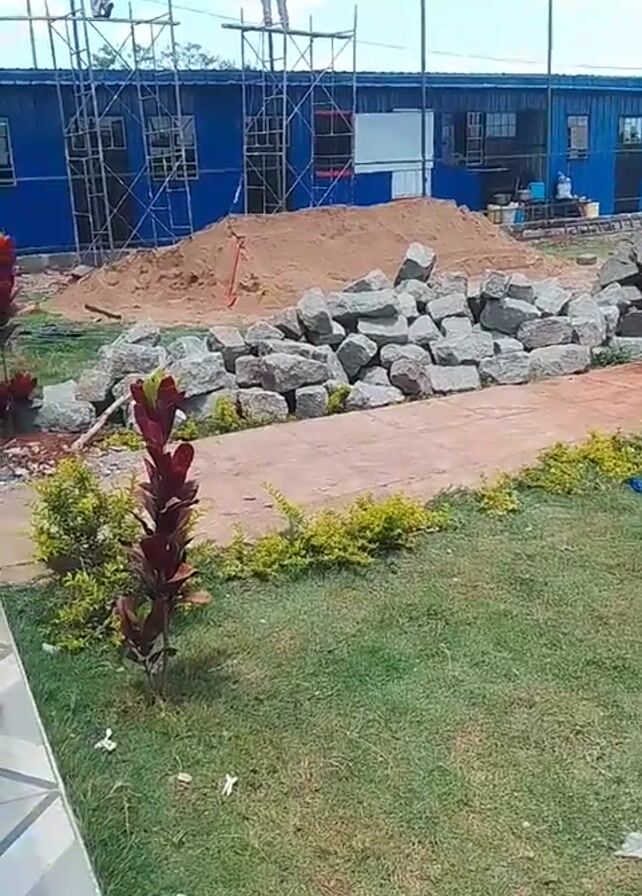 n outdoor construction site with a blue building in the background, where two people are working on scaffolding. A pile of dirt and a heap of gray rocks are positioned in front of the building. A small red plant and some greenery are present in the foreground, along with a grassy area. The camera pans right, revealing a metal barrel with a hose, a water bottle, and scattered debris on the grass. In the distance, a man walks across the grass towards a fence and a small red truck. The ground also has bits of discarded lumber and patches of reddish dirt.