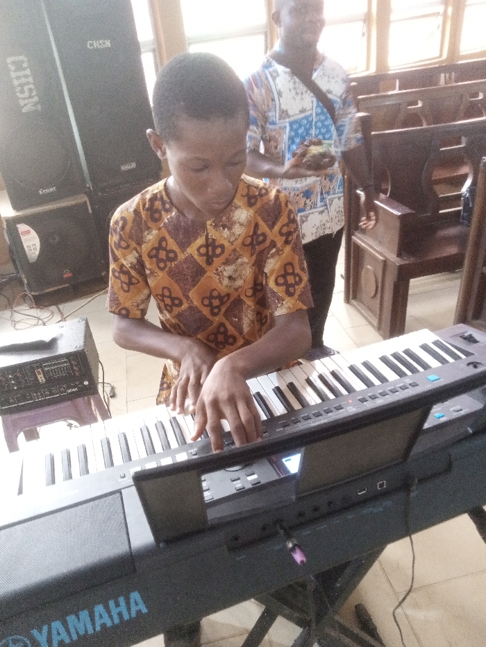 The image displays an indoor scene in Ukwu-Abwa, Nigeria. In the foreground, a young male, dressed in a brown, orange, and black patterned short-sleeved shirt, operates a grey Yamaha digital keyboard, actively pressing keys with both hands. A purple audio jack is connected to the right side of the keyboard. To the left, a black audio mixing console rests on a purple stool, positioned near a stack of black speakers: two large units, one marked "CHSN" and "Senoy," atop a smaller speaker. Electrical wires are visible on the light-colored tiled floor. In the background, a second, adult male, slightly out of focus, wears a blue, white, and black patterned shirt and holds a small, dark, irregularly shaped object in his left hand. Dark wooden pews or benches and multi-paned windows are visible on the right side of the background.