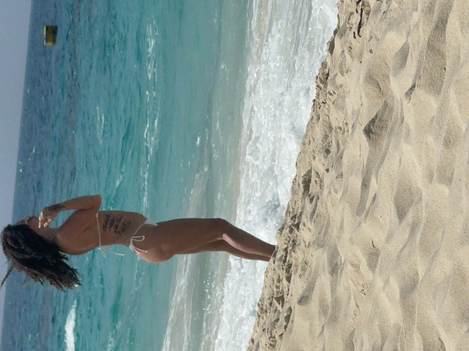 An outdoor scene depicts a female individual on a sandy beach in Zanzibar, Tanzania, standing at the edge of the turquoise ocean