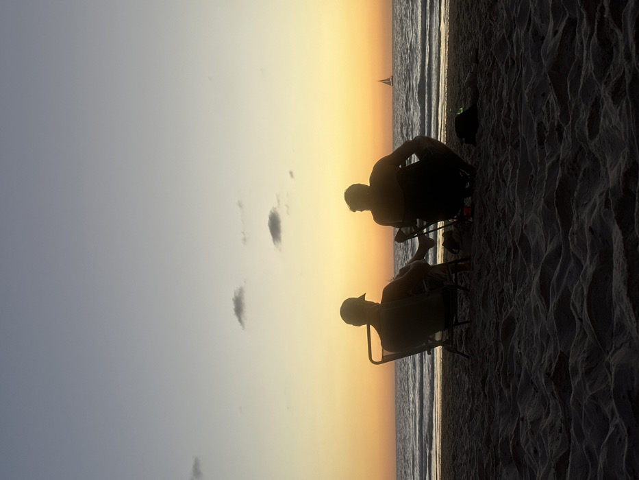 This image depicts a beach scene at sunset in Herzliya, Israel