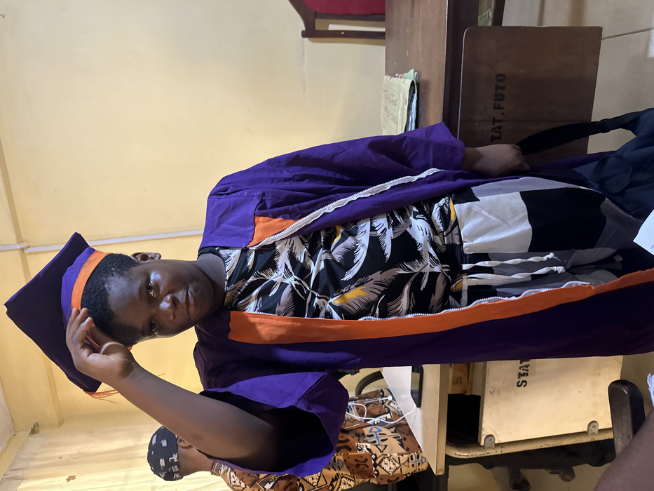 The image depicts an indoor scene in Ihiagwa, Nigeria. A central figure, an individual with dark skin, is positioned facing the camera, wearing a purple academic gown with orange trim and a matching academic cap, which they are adjusting with their right hand. Beneath the gown, a black patterned top with white and yellow elements is visible, along with black and white patterned trousers secured by a white drawstring. A black bag is held in the subject's left hand, partially out of frame. To the left background, a second individual is partially visible from the back, wearing a brown patterned shirt and a dark patterned head covering. The room features light yellow walls. A light-colored desk with a dark smartphone is located on the left. On the right, a dark wooden desk holds a stack of documents. A wooden panel bearing the stenciled text 'TAT. FUTO' in black letters is visible to the right. A chair with a red cushion is partially observed behind the right desk. The scene is lit by interior artificial light.