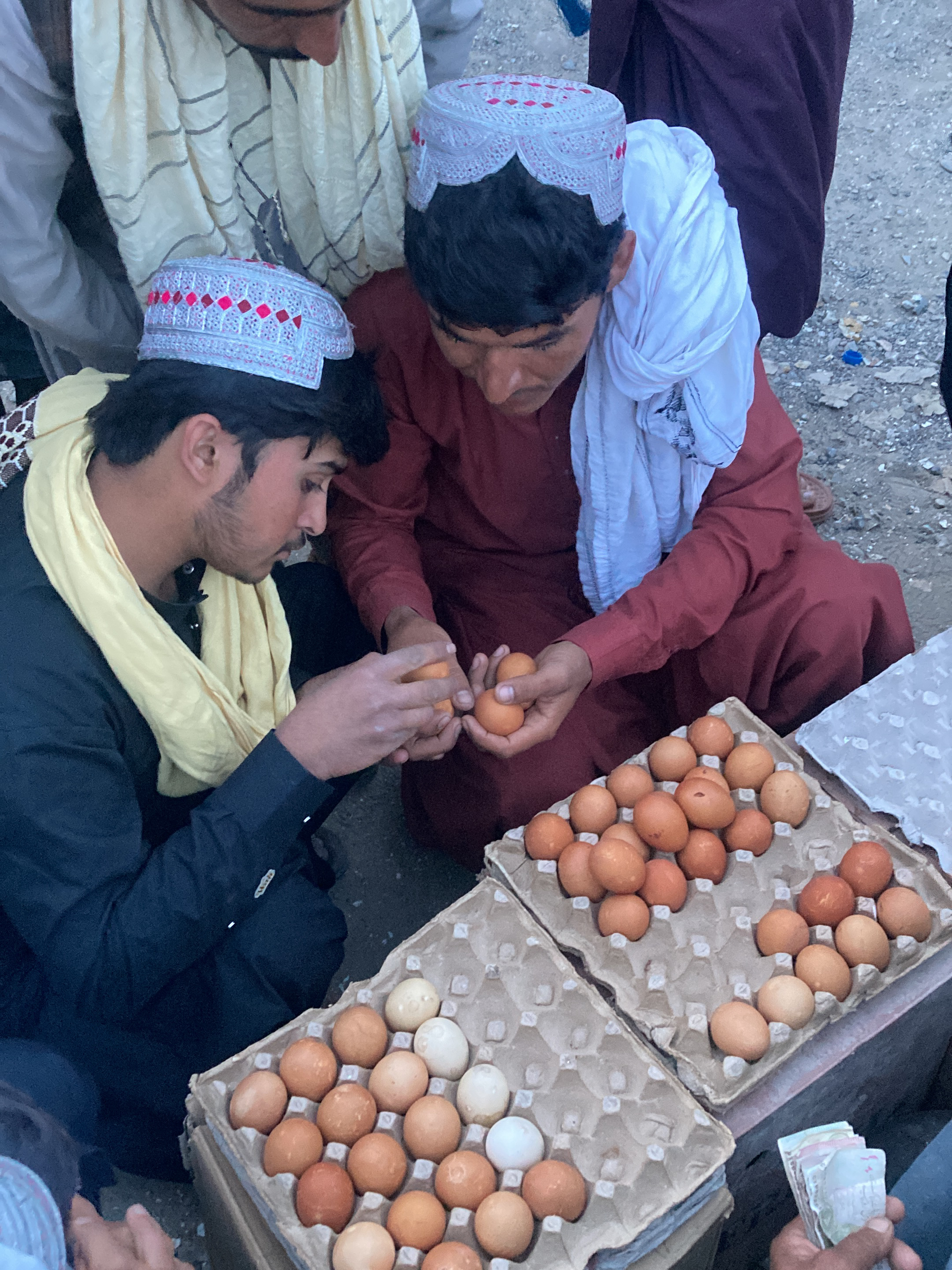 In Yaro, Pakistan, two men wearing traditional caps examine eggs. One man wears a black shirt and a yellow scarf; the other wears a maroon outfit with a white scarf around his neck. They hold eggs in their hands, inspecting them over two egg cartons filled with brown and white eggs. Other people stand around them. Money is visible near one of the egg cartons. The setting appears to be an outdoor market.