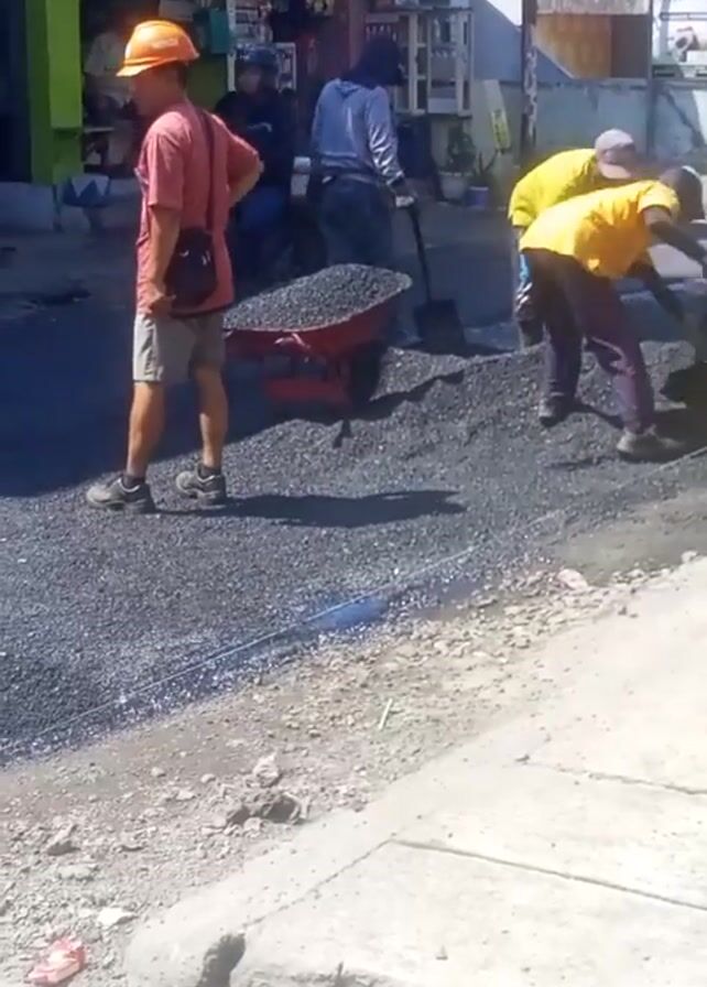 The scene shows a group of construction workers repairing a road on what appears to be a sunny day. One worker in an orange hard hat, a pink shirt, and shorts stands near a red wheelbarrow filled with gravel. Two other workers, one in a yellow shirt and another partially obscured, are actively spreading the gravel on the road surface. A motorcycle is parked nearby, and shops are visible in the background. The road is freshly covered with the gravel, contrasting with the older concrete sidewalk in the foreground.