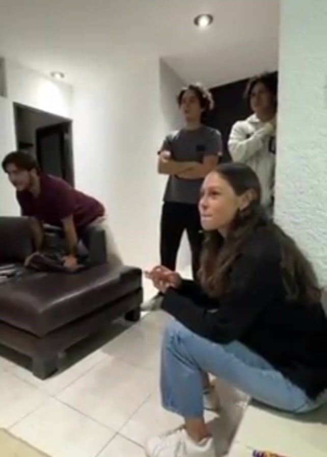 Four people are in a room, watching something with anticipation. A woman sits on the floor, wearing a black shirt, blue jeans, and white sneakers. A man is sitting on the edge of a brown leather couch, wearing a maroon shirt. Two more men are standing against a white wall, one wearing a grey shirt and the other wearing a white sweatshirt. Suddenly, something happens on screen and they all react in shock and dismay. The woman on the floor covers her face. A bag of chips is on the floor near the woman. The room has white tiled floors and white walls, and a black door is visible in the background.