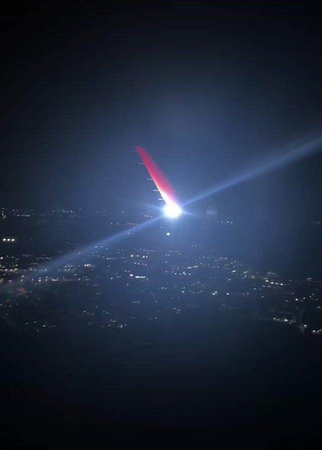 night view of a city from above, with a crescent moon visible in the sky. The city lights are spread out below, and a bright light source, possibly a searchlight, shines upwards with a red beam. The surrounding area is dark, with only a few faint outlines of landforms visible.