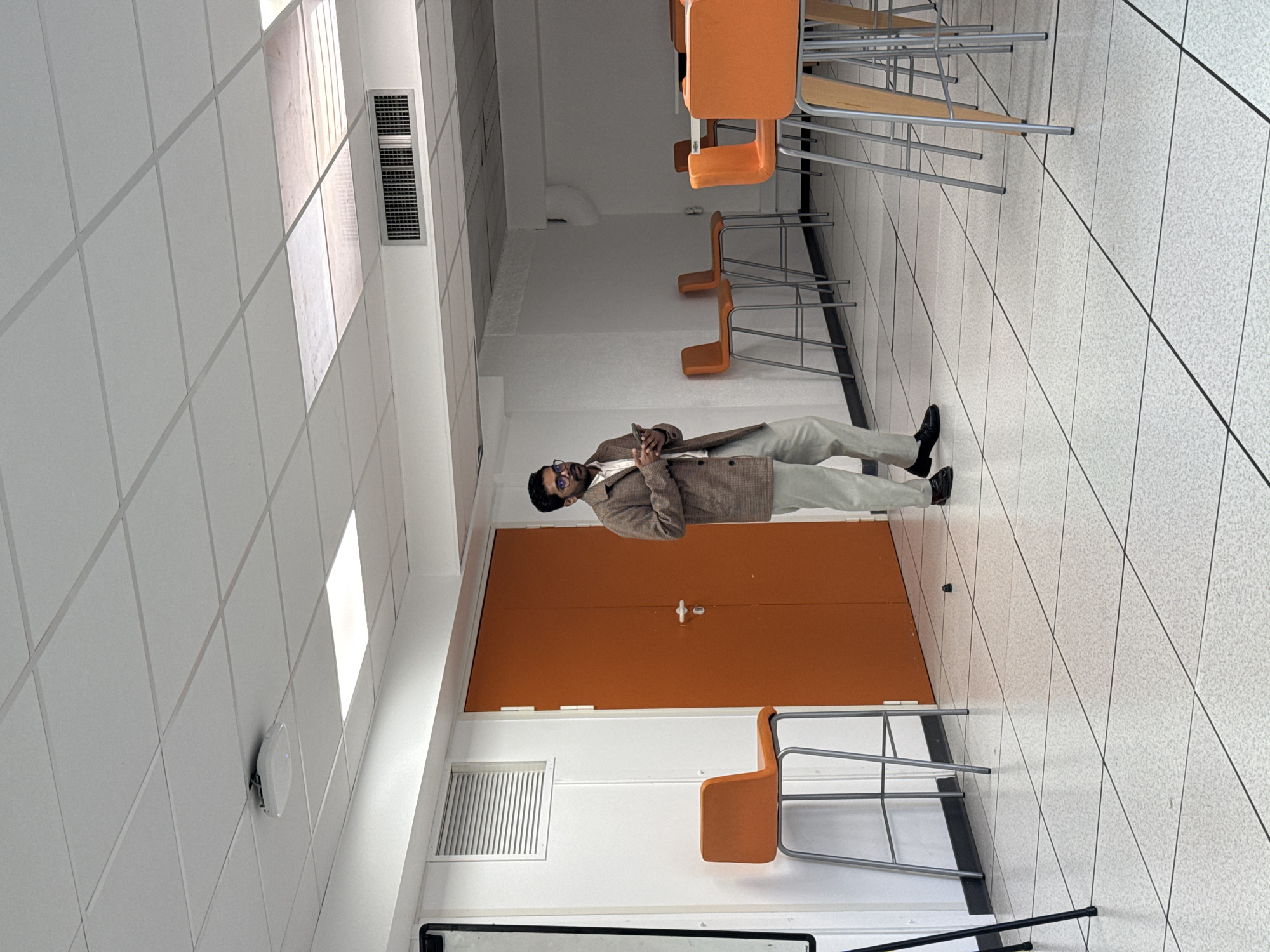A lone adult male stands in a well-lit, tiled room within a building in Valbonne, France. He is positioned slightly left of center, facing forward and slightly to his right, holding a smartphone with both hands and looking down at it. The man has dark hair, a beard, and wears glasses, a patterned brown blazer, a light-colored collared shirt, light-colored trousers, and dark loafers. The room features white paneled walls, a white suspended grid ceiling with square acoustic panels, and multiple square fluorescent light fixtures. An orange double door with silver handles is visible on the left wall, next to a black-framed vertical structure and a white louvered vent. Several orange high-backed bar stools with silver metal frames are arranged throughout the space; one is prominent on the left, and others are visible to the right, some paired with white rectangular tables. The floor is covered with white square tiles featuring a speckled pattern and dark grout lines. A small, dark, cylindrical object rests on the floor near the orange doors. Ventilation grates and a ceiling-mounted device (possibly a Wi-Fi access point) are also present.