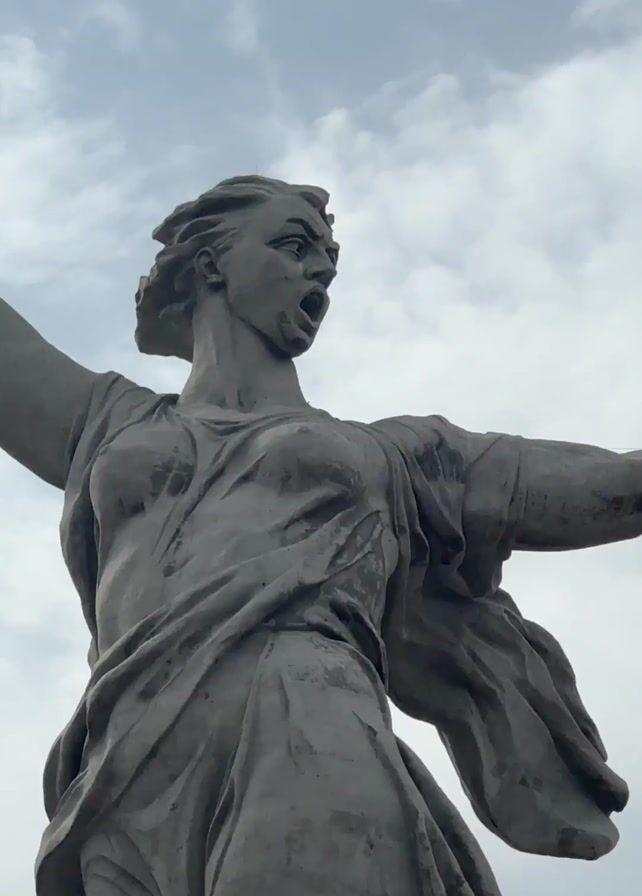 large, gray statue of a woman with her mouth open, as if shouting. She is holding a sword in one hand and her other arm is outstretched. She is wearing flowing robes. The sky is visible in the background, with clouds. A few people are visible at the base of the statue. The camera pans up from a close-up of the woman's face to show the entire statue.
