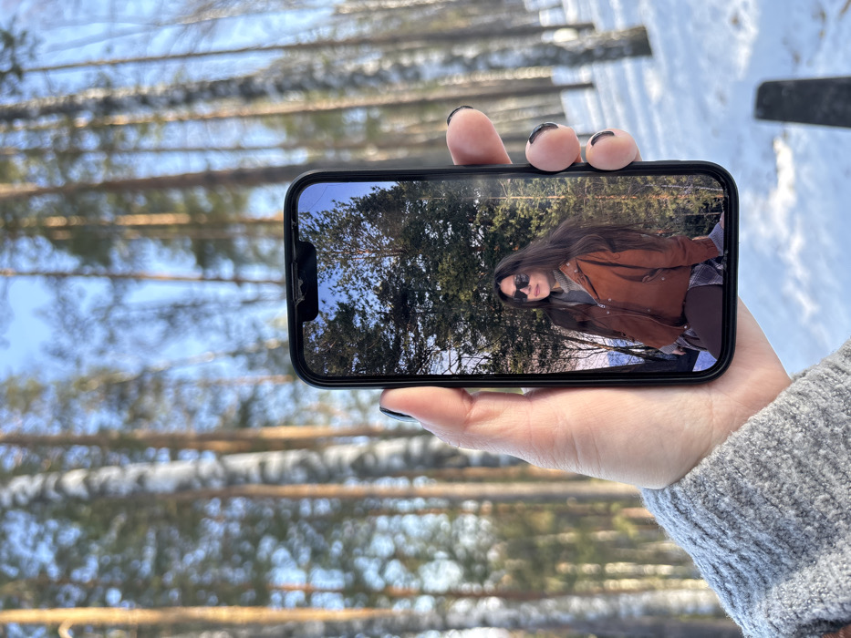 - "A person's hand, partially covered by a grey knitted sleeve, holds a black smartphone vertically in a snow-covered forest in Klenovaya Gora, Russia" by FM-mFtzC3, licensed under CC BY 4.0