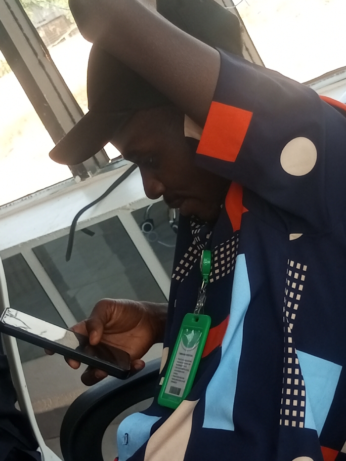 A dark-skinned individual, seen in profile facing right, is seated in an indoor setting. The person wears a navy blue garment featuring abstract geometric patterns in orange, white, and light blue. A dark baseball cap with a forward-facing brim is worn, covering the upper portion of the head. Dark-framed eyeglasses are suspended from the head, hanging near the left temple. The individual's right hand grips a black smartphone, whose reflective screen displays a prominent linear reflection on its upper left portion. A green retractable ID badge holder is clipped to the garment on the right side of the torso; the green ID card inside clearly displays "TRUMAN HOSPITAL" and additional text in white. The individual's left forearm or hand is positioned above the head, resting on the cap. In the background, a window structure with white frames and glass panes is visible, overlooking a blurred, light-colored outdoor environment. A dark chair armrest is partially visible in the lower left. The scene is located within Truman Hospital in Jos, Nigeria.