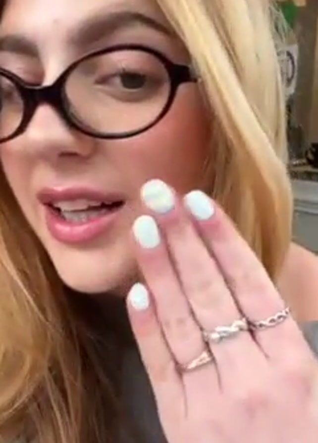 Here is a detailed description of the video: The video shows a woman with long, strawberry blonde hair and black-rimmed glasses. She is indoors, and seems to be on a city street as a “London” sign is faintly visible in the background. She is wearing a grey top. She holds up her hand to show off her nails. Her nails are painted white and are decorated with vertical stripes of blue, yellow, and white. She is wearing a ring on her ring finger shaped like a safety pin, a ring in the shape of a lightning bolt, and another ring on the same hand. She is smiling and says, "Summer nail inspo!"