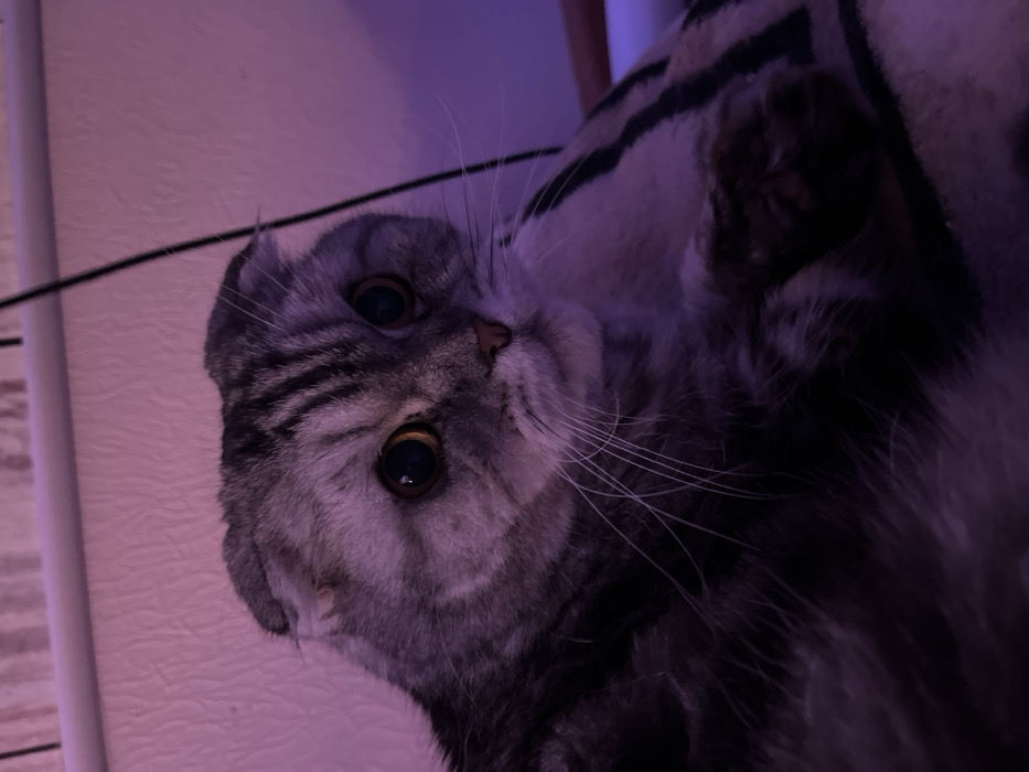 - "The image displays a Scottish Fold domestic cat with grey and black tabby markings, positioned from the chest up against an interior background illuminated with magenta-violet light" by FM-khv1N2, licensed under CC BY 4.0