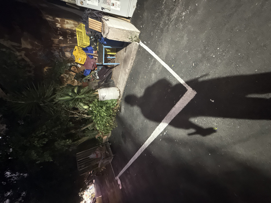 The image depicts a nighttime scene in an urban alleyway or narrow street in Tel Aviv, Israel. In the immediate foreground, a long, dark shadow of an individual extends towards the viewer, projected onto an asphalt surface. The shadow's left hand appears to grasp a bottle-shaped object. Two prominent white lines painted on the asphalt form an "L" shape, encompassing the shadow's lower body. To the left of the scene, a large, rectangular metal trolley with a cage-like structure is parked next to a dense patch of dark green vegetation. Further left, beyond the trolley, diffuse artificial lighting suggests a bustling area or thoroughfare. The right side of the image features a cluttered area against a backdrop of a light-colored wall with visible Hebrew script graffiti, including "לא תשלח" (Lo Tishlach - "You shall not send/stretch out"). Below this wall, on a raised concrete platform, are several yellow and blue plastic crates, a small blue metal stool, and various dark, unidentifiable discarded items. A white barrel, containing a potted plant, stands amidst a cluster of diverse green plants and shrubs. To the far right, a white cabinet or appliance-like object is visible. The scene is illuminated by an unseen artificial light source positioned behind the camera, casting strong shadows.