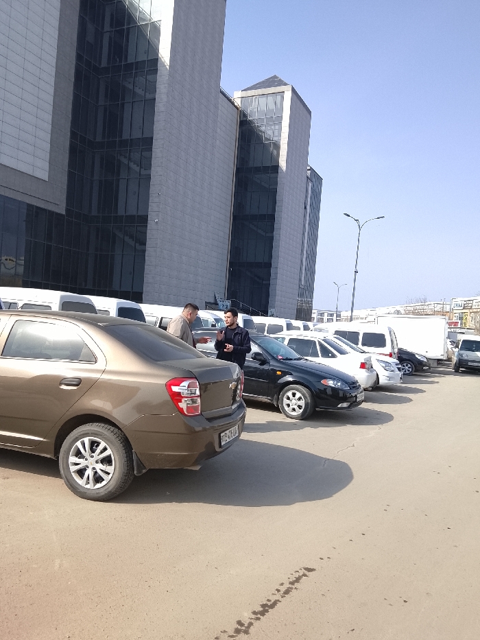 The scene depicts an outdoor parking area in Urgench, Uzbekistan, on a clear, sunny day