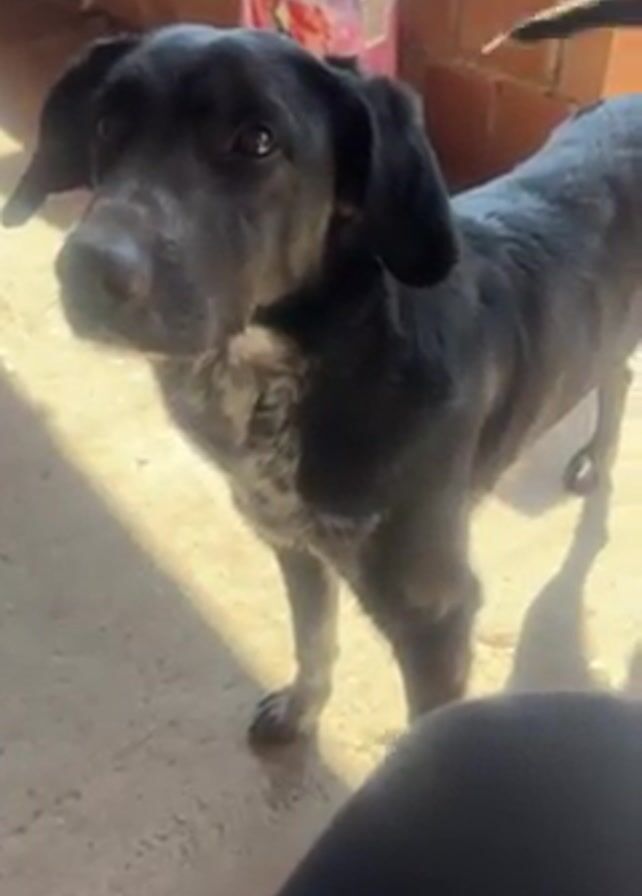 dark gray or black dog standing on a light-colored, possibly concrete surface. The dog looks towards the camera, then turns its head slightly as a hand reaches out towards its muzzle. The dog is in a shaded area, with visible sunlight creating shadows on the ground. Behind the dog is a brick wall, and a partially visible bag of what appears to be dog food. A person's leg is visible in the foreground, suggesting the video is being recorded from a seated position.