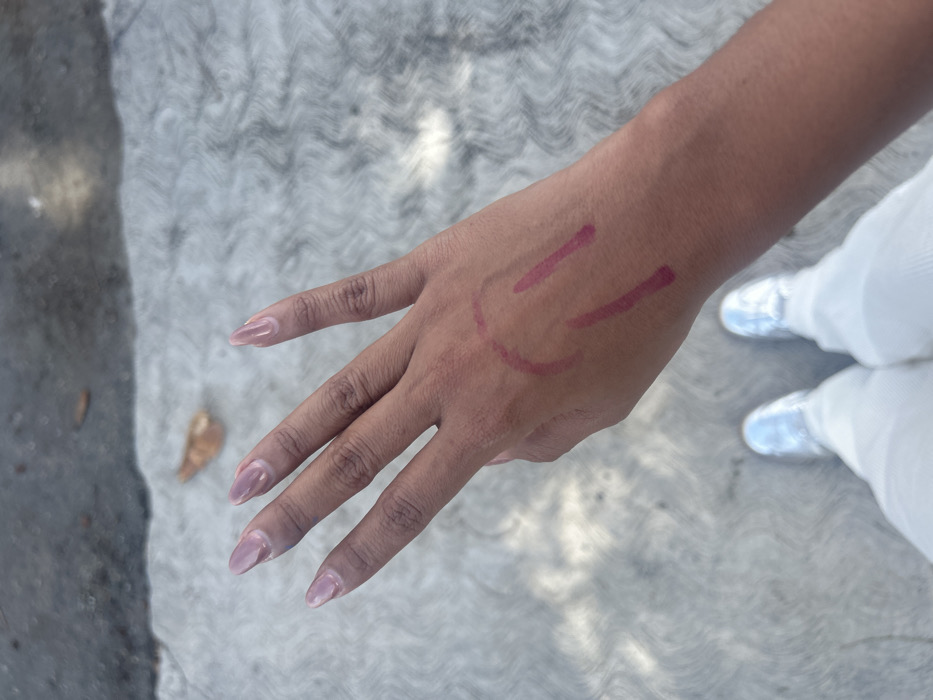 An overhead forensic image displays a human right hand, palm-down with fingers extended, positioned above a textured grey paved surface in Valencia, Venezuela. The hand, exhibiting medium-dark skin pigmentation, features five digits, each with a long, pointed nail coated in a translucent pale pink or clear polish. The dorsal surface of the hand bears two distinct markings in a dark reddish-pink cosmetic substance: an inverted 'U' shape and two parallel vertical lines positioned below and to the right of the 'U'. Partially visible below the hand are the lower legs and feet of an individual, dressed in white trousers and shiny, light-colored shoes. The ground, likely concrete or asphalt, displays varying shades of grey and textured patterns, with a singular dry brown leaf situated in the upper-left quadrant and scattered shadows.