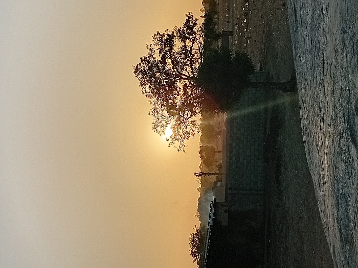 The golden sunlight filters through the branches of a tree, casting a warm glow. A building is nestled among other trees with one standing out. A large rock or wall occupies the right side of the image. The overall scene appears hazy with a soft light quality.
