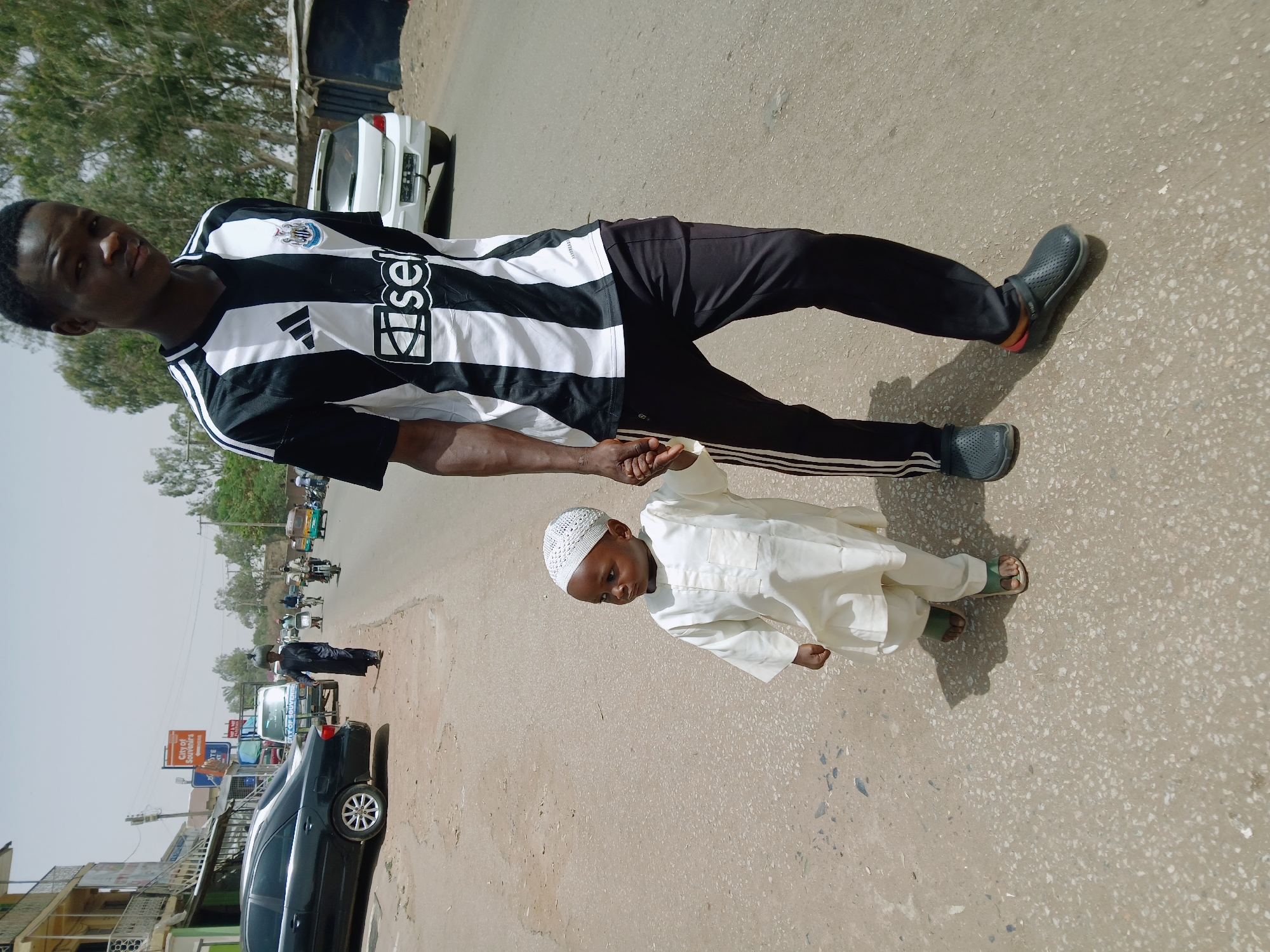 The image depicts a young adult male and a small child walking hand-in-hand on a paved road in Kitwe, Zambia, under bright daylight. The adult male, on the right, is dark-skinned and wears a black and white vertical striped Adidas football jersey with a Newcastle United crest and an "isel" sponsor logo. He has on black tracksuit bottoms with white stripes down the outer seams and dark grey slip-on clogs. He is looking towards the viewer. The small child, on the left, is also dark-skinned and wears a white long-sleeved tunic (thawb-style garment) with a left chest pocket, a white crocheted kufi cap, and green open-toed sandals. The child is looking towards the left side of the frame. Both individuals are walking forward on the asphalt surface. The environment shows a city street scene. On the left, a black sedan is parked partially on an unpaved verge. Behind it, a multi-story building with balconies is visible, featuring an orange sign that reads "City of Souvenirs" and "HERE" with an arrow. Further down the road, another person walks carrying an item on their head, and various vehicles including a white van, motorcycles, and a green three-wheeled auto-rickshaw (tuk-tuk) are present. On the right, a white sedan is parked, and behind it, a structure made of corrugated iron sheets is visible, followed by numerous tall, leafy green trees. The ground is a light grey asphalt with visible aggregate. Shadows indicate a high sun position.