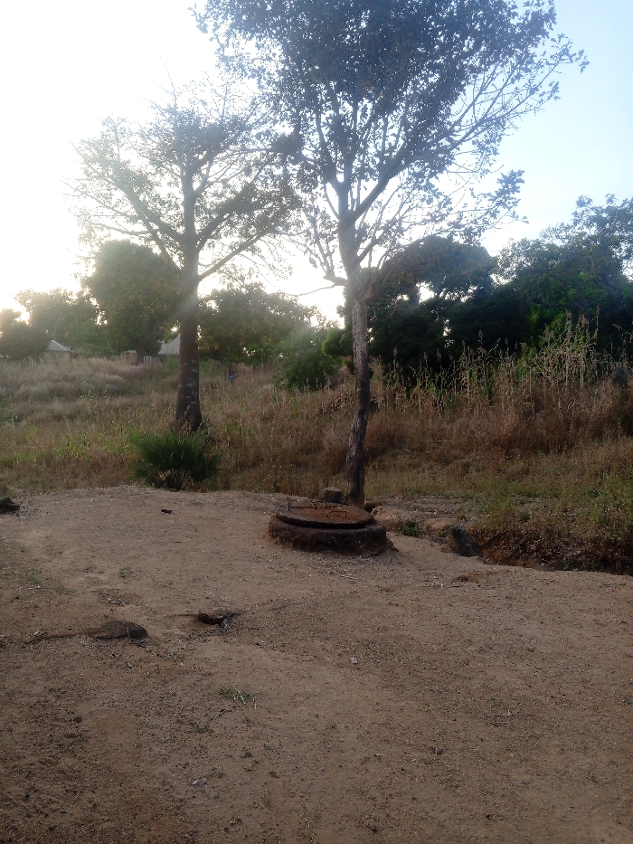 A dirt road leads to a pair of trees with sparse foliage and cylindrical trunks. The road is sandy and dusty with small rocks. A well, with a circular concrete ring and metal lid, sits nestled between the trees. The background features a grassy field with dense vegetation, a building, and trees that fade into the sky. The lighting is soft, suggesting either early morning or late afternoon.