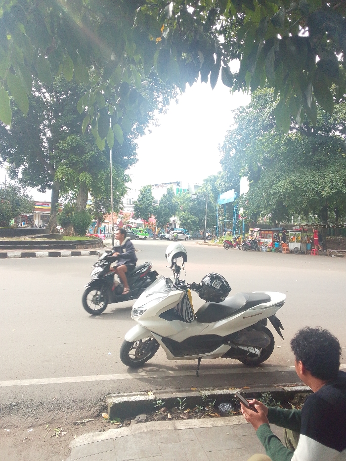 A street scene captures a mix of urban and natural elements. A white scooter with two helmets attached stands near the curb, while a black scooter crosses the street. On the right, a person with curly hair looks at a smartphone. Across the street, vendors and motorbikes line the edge of a park area, with lush green trees overhead, creating a canopy that filters sunlight. Buildings are visible in the background.