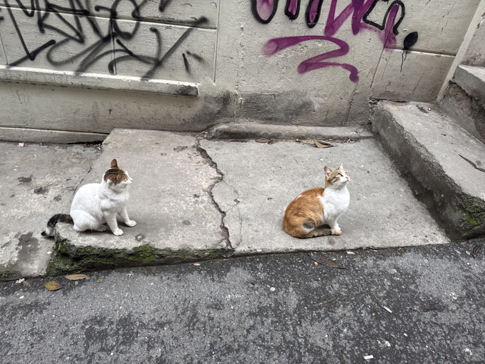 Two domestic short-haired cats are situated on a concrete ground surface in an urban outdoor setting within Beyoğlu, Turkey