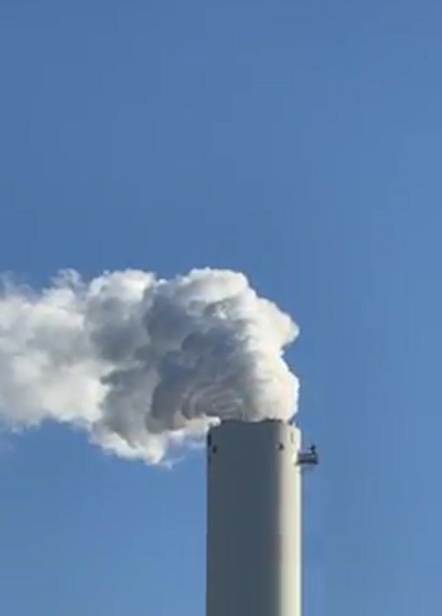 A vertical shot shows a tall smokestack releasing a plume of white smoke against a clear blue sky