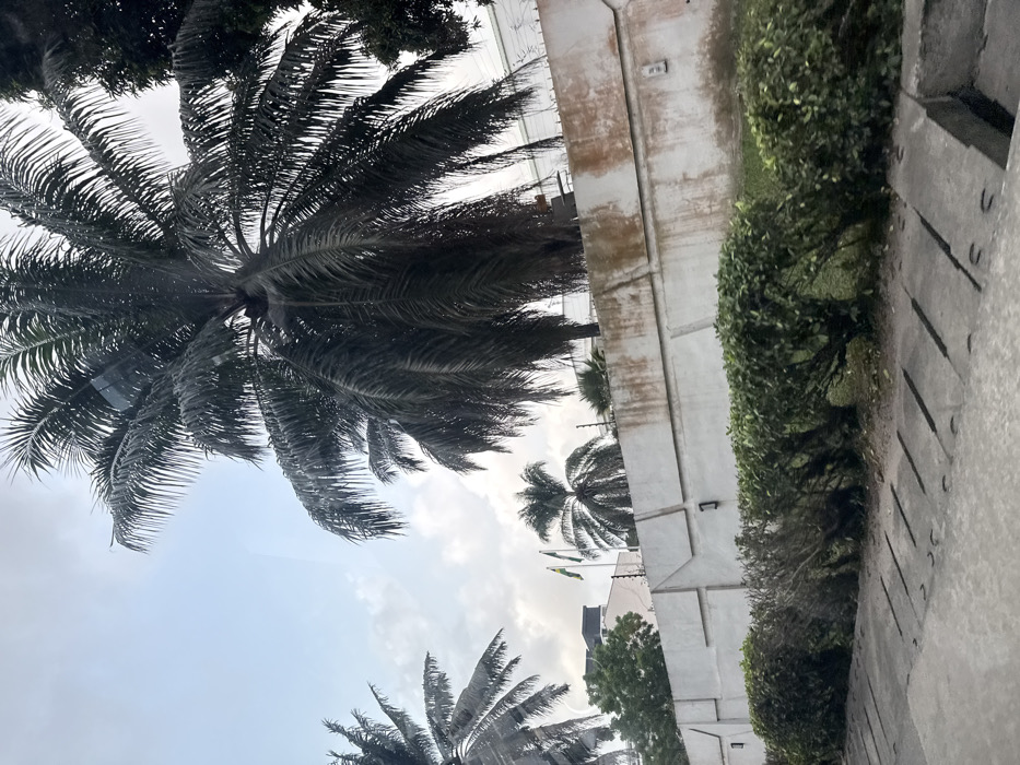The image presents an exterior scene in Falomo, Nigeria, dominated by a tall, light-colored concrete perimeter wall under a partly cloudy sky. The wall features a geometric pattern of recessed panels and exhibits significant reddish-brown staining, likely from moisture, particularly on its upper half. Barbed wire or razor wire is affixed along the entire visible length of the wall's top edge. In the foreground, a concrete surface with parallel linear depressions, possibly a sidewalk or drainage system, runs horizontally. Immediately behind this, a line of manicured green bushes extends along the base of the wall. Numerous large palm trees, characterized by their dark green fronds, are visible throughout the upper and mid-sections of the image, some extending beyond the frame. Behind the wall and amidst the trees, two flagpoles bear flags with alternating green and yellow/gold stripes. The dark roofline of a building is partially visible beyond the wall and palm trees. No individuals or discernible activities are present in the depicted environment.