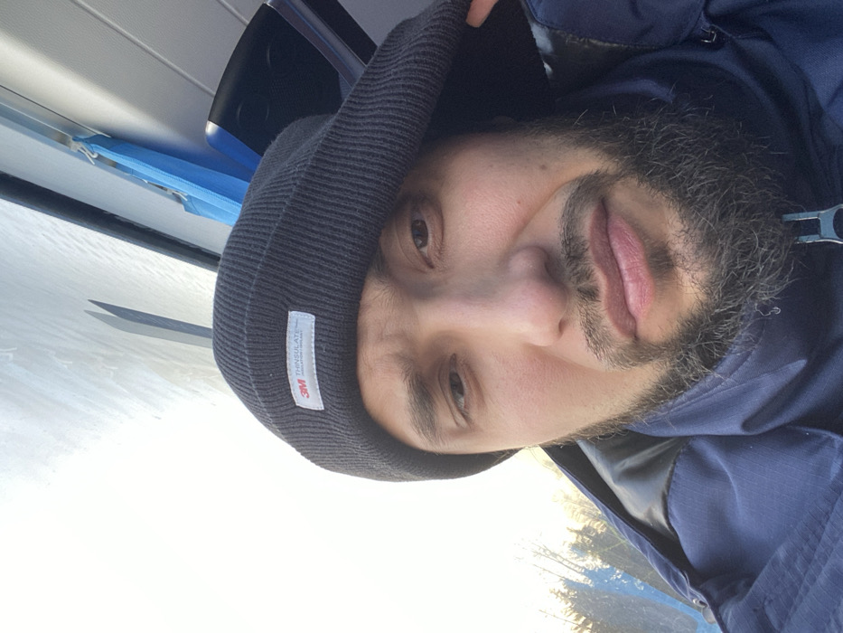 A single adult male is depicted in a close-up, selfie-style photograph. He possesses a light-brown complexion, dark eyes, and a full dark beard and mustache. He is wearing a dark blue knitted beanie with a white rectangular label on the front that reads "3M Thinsulate Insulation / Isolant," and a dark blue jacket with a visible zipper pull. His left hand is positioned near the right side of his beanie, suggesting adjustment. The subject is situated within what appears to be a vehicle, evidenced by interior structural elements visible in the upper right quadrant including a light-colored ceiling, a dark bar, and a blue fabric object. Through a window on the left, an outdoor environment is discernible, featuring a clear, bright sky and the tops of dark green coniferous trees in the distance. The lighting is natural and bright. The location is Luzhitsy, Russia.