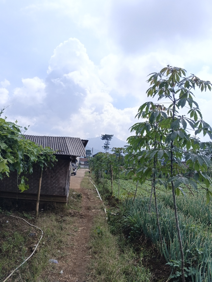 A rural scene presents a dirt path flanked by a weathered, hut-like structure with a corrugated roof on the left, and a vibrant garden on the right. Tall green trees with large leaves stand amidst rows of onion crops. In the distance, a mountain is visible under a sky filled with puffy white clouds. A small vehicle is parked near other buildings in the background. A white hose lies on the grassy area beside the path.