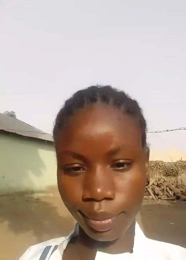 A young woman with braided hair looks directly at the camera with a slight smile. She wears a white top. The background shows a rural setting, with a small green building, a pile of logs, and a tree visible under a bright sky. The video appears to be taken outdoors in daylight.