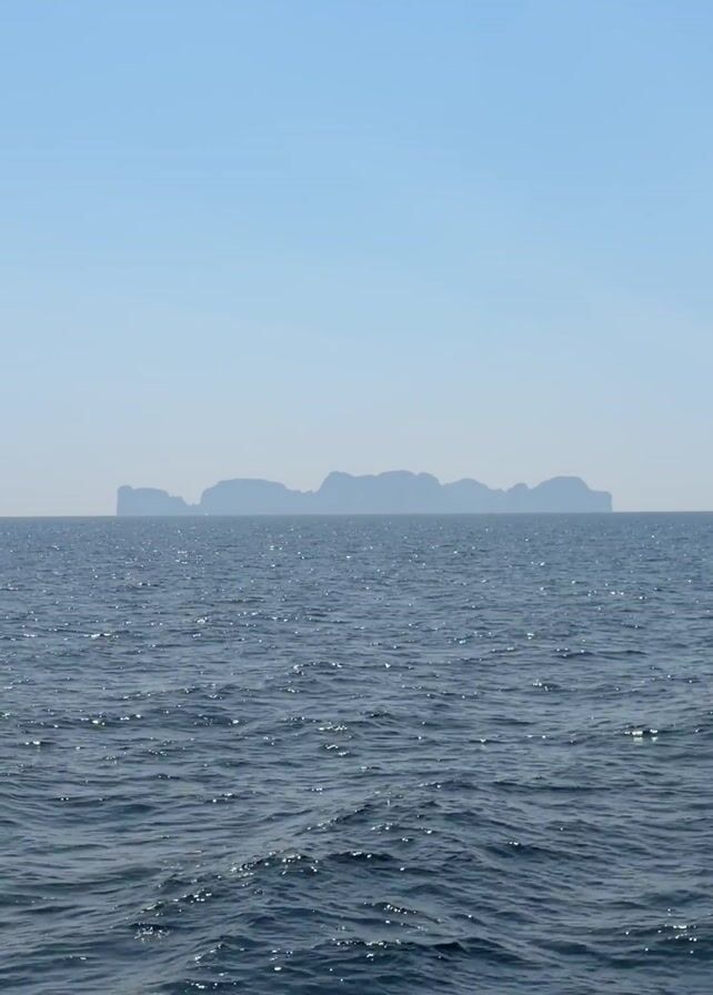 n open ocean scene. The water is dark blue with light reflecting off the small waves. In the distance, a series of land masses are visible, appearing as indistinct silhouettes against the light blue sky. The scene is still and appears to be captured during a bright day.