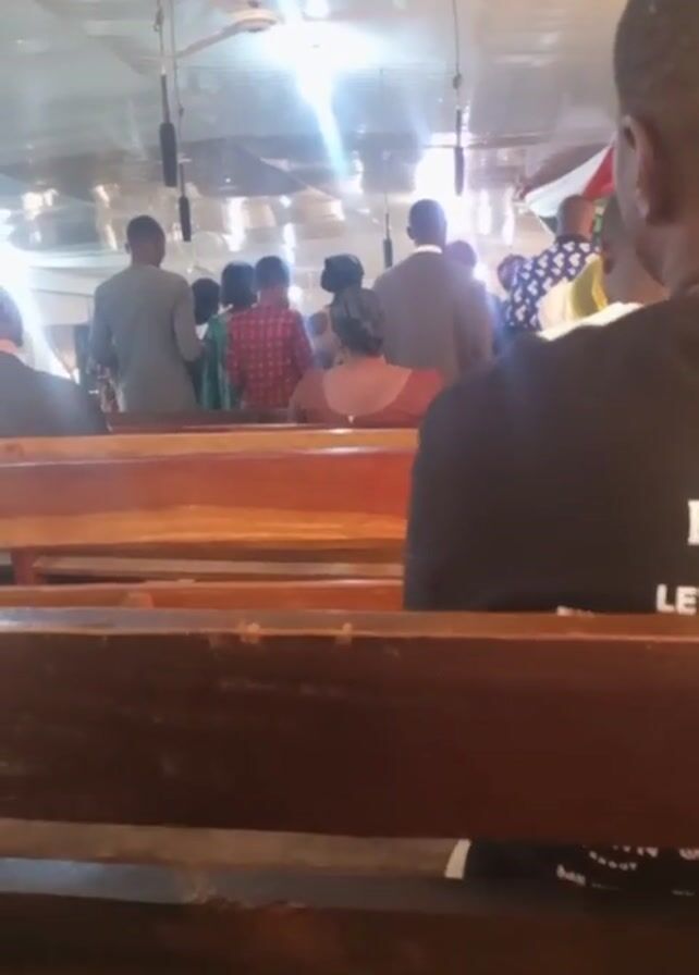The camera is positioned from a low angle behind wooden church pews. In the background, a group of people stand facing away from the camera, likely towards the altar or front of the church. The individuals' clothing styles vary, including suits, dresses, and patterned shirts. Ceiling fans and hanging microphones are visible above the crowd, along with a brightly lit white ceiling that reflects the sunlight. The person filming is sitting in the pew and wearing a black t-shirt with white lettering.