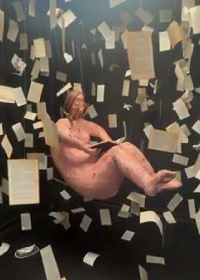 n art installation. A pink, nude sculpture of a woman is suspended in midair, in a seated position, reading a book. The sculpture is surrounded by loose book pages, also suspended in the air with strings. The backdrop is black, and there's a window above. The floor is also black.