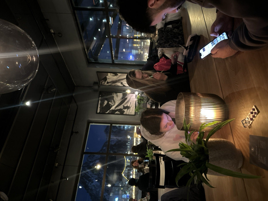 A group gathers at a warmly lit table, illuminated by a central candle. Some are engrossed in their phones. A pill packet and a menu rest on the table's edge. Through the window, a night scene unfolds with lights twinkling against a dark mountain backdrop, mirrored in the interior's hanging fixtures and artwork. The image is vertically oriented.
