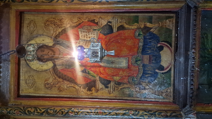 This image depicts an aged religious icon situated within an ecclesiastical setting in Topolovets, Bulgaria