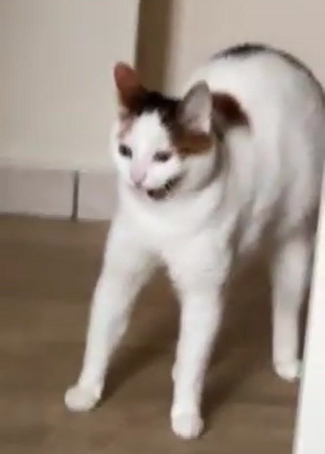 A white cat with brown and black markings stands on a wooden floor in front of a white wall. The cat arches its back and opens its mouth in a possible yawn or hiss. The cat then sits on the floor and looks to the side.