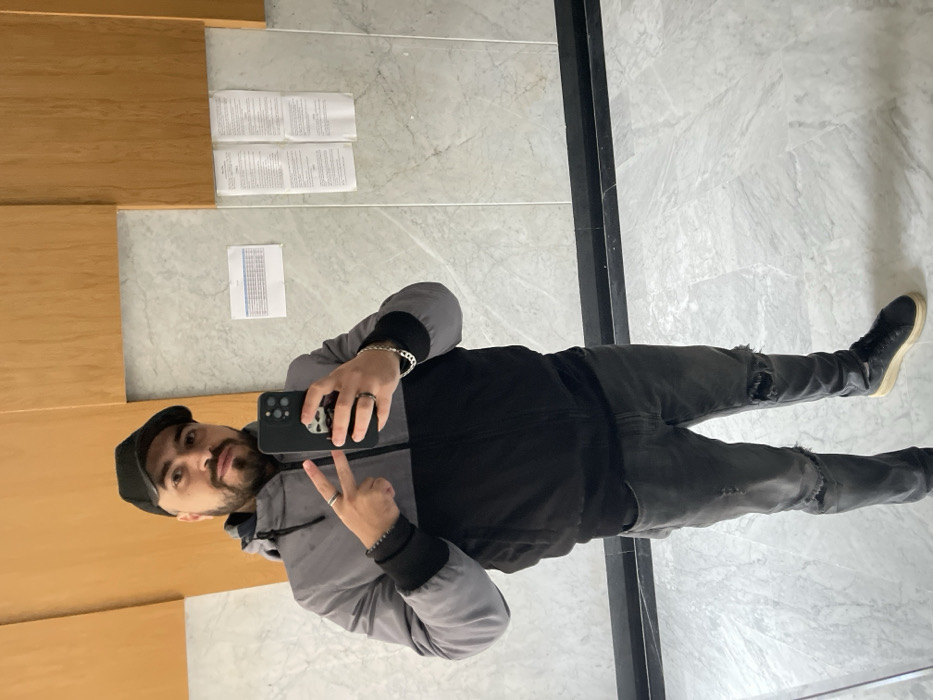 A male individual stands in what appears to be an indoor hallway or lobby in the city of Meknes, Morocco, taking a mirror selfie